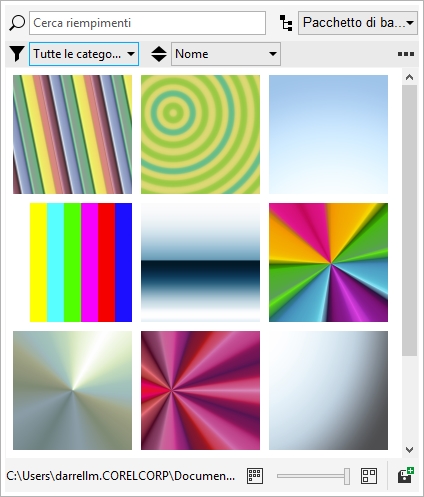 Per iniziare, Corel offre riempimenti locali elencati in Contenuti utente nei selettori Riempimento e Trasparenza. Tali riempimenti vengono memorizzati nella cartella Documenti\Corel\Corel Content\Fills. Se si desidera espandere la propria raccolta di riempimenti, è possibile scaricare altri pacchetti di riempimenti dalla finestra di dialogo Ottieni altro.
