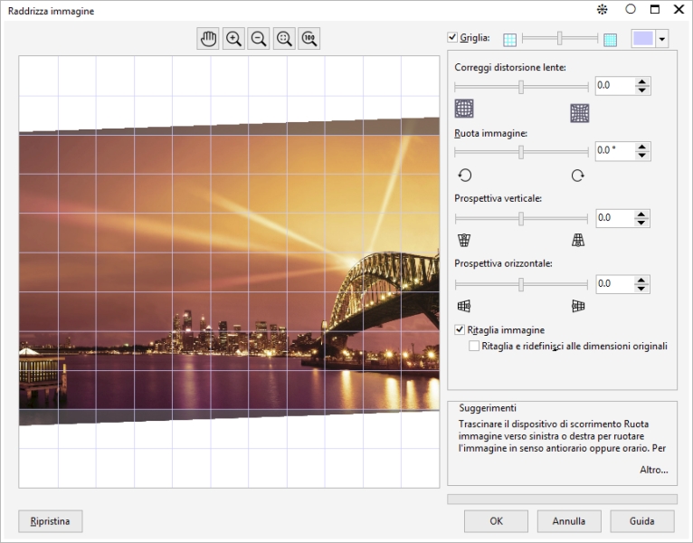 La finestra di dialogo Raddrizza l'immagine consente di correggere le distorsioni lente e raddrizzare le immagini bitmap velocemente. Si tratta di un'utile funzione per raddrizzare fotografie scattate o acquisite tramite scanner con un angolo o che contengono distorsioni della lente.