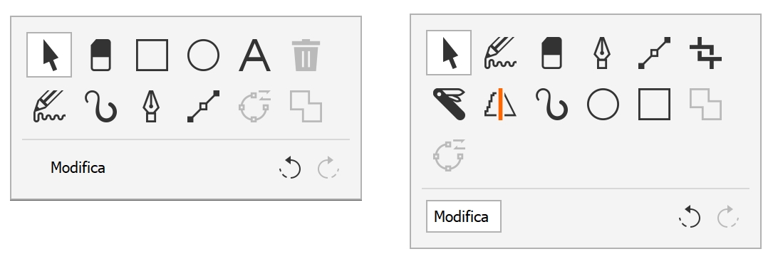 A sinistra: Il pannello Strumenti predefinito. A destra: Un pannello Strumenti personalizzato. In questo esempio, vengono aggiunti nuovi strumenti (Ritaglia, Coltello e Disegno assistito); il pulsante Elimina viene rimosso e gli strumenti riordinati.