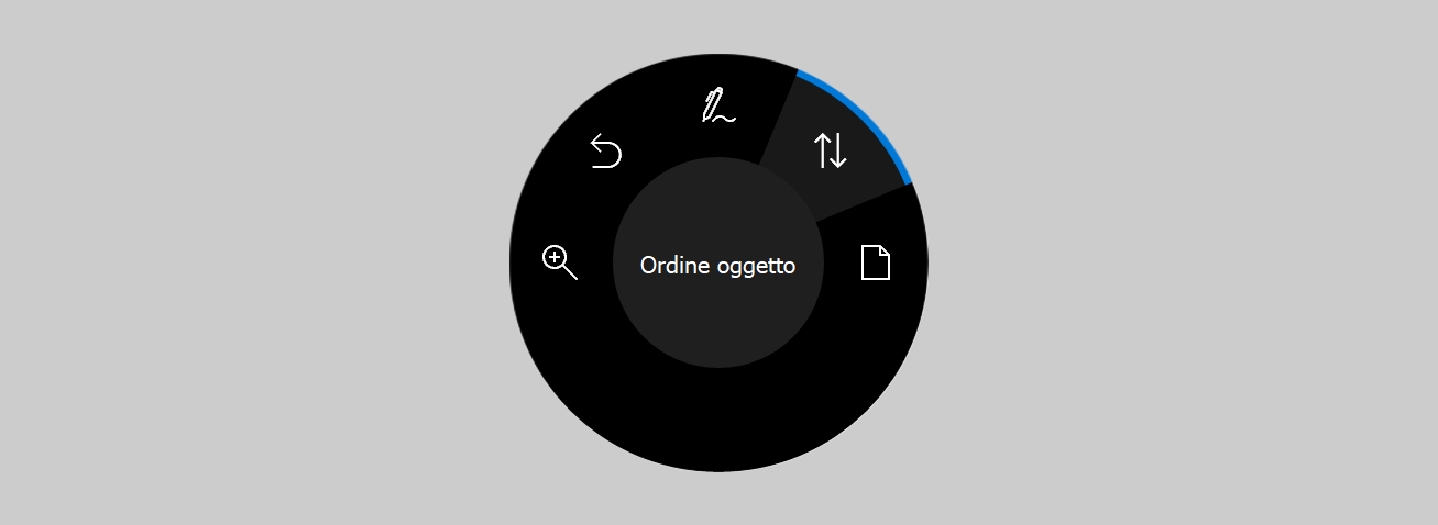 Quando il dispositivo di puntamento con rotellina è fuori dallo schermo, la sua interfaccia visualizzata sullo schermo consente di aumentare o ridurre lo zoom, nonché annullare e ripetere varie operazioni. Inoltre, ora è possibile accedere alle pagine del documento e modificare l'ordine degli oggetti spostandoli davanti o dietro ad altri oggetti. Inoltre, il dispositivo di puntamento con rotellina può aiutare l'utente a utilizzare lo strumento LiveSketch in modo più efficiente. Per ulteriori informazioni, consultare Dispositivi di puntamento con rotellina e strumento LiveSketch.