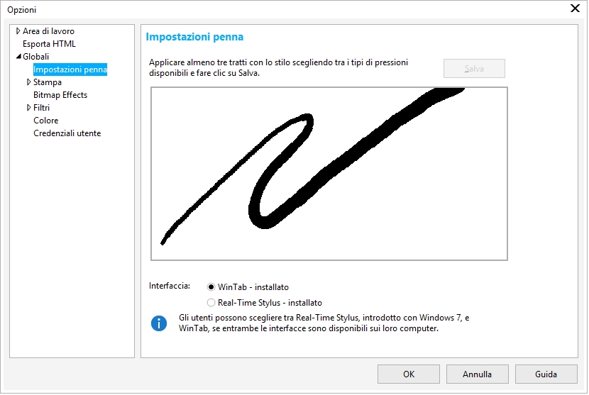 WinTab: consigliato per dispositivi o tavolette grafiche compatibili con Wacom |