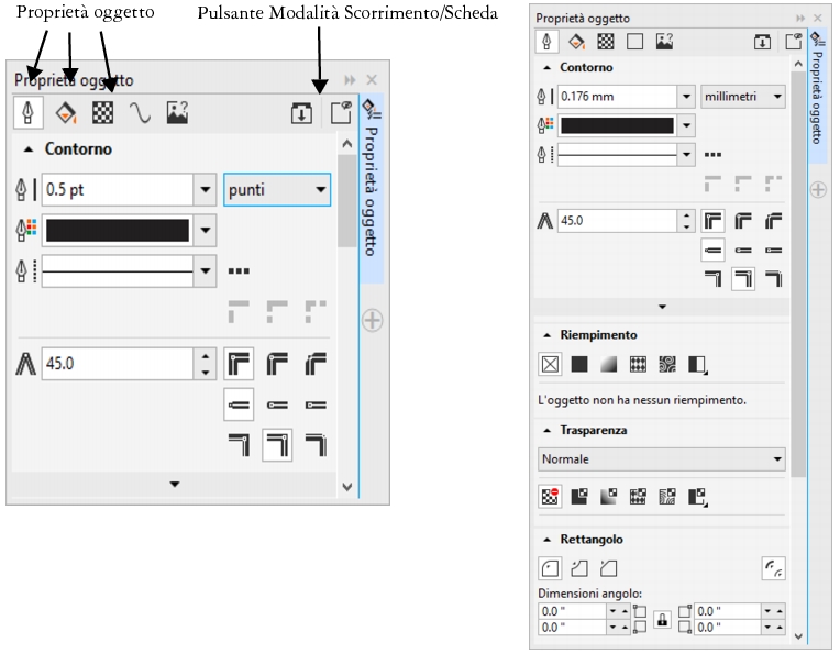 È possibile raggiungere rapidamente le proprietà da modificare, utilizzando i comandi nella parte superiore della finestra mobile Proprietà oggetto. Inoltre, sono disponibili due modalità di visualizzazione: scorrimento e schede. La modalità di scorrimento visualizza tutte le proprietà oggetto rilevanti, permettendo di scorrere le opzioni necessarie. La modalità a schede mostra solo un gruppo di proprietà oggetto per volta, nascondendo le altre opzioni. Ad esempio, è possibile visualizzare solo le opzioni di riempimento e poi fare clic sul pulsante Contorno per visualizzare solo le opzioni di contorno.