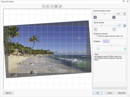 V dialogovém okně Narovnat obrázek můžete rychle provést korekci zkreslení objektivu a narovnat rastrové obrázky. Tato funkce je užitečná pro narovnávání fotografií, které byly pořízeny nebo naskenovány pod určitým úhlem nebo obsahují zkreslení objektivu.