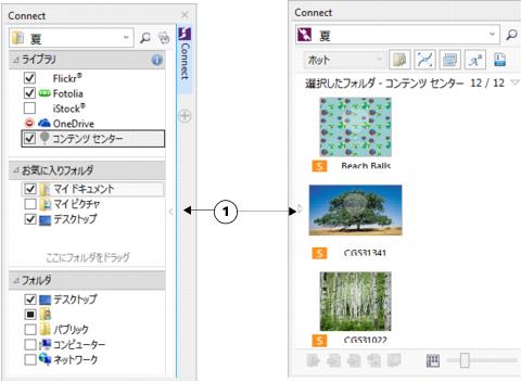 表示ペイン (左) とナビゲーション ペイン (右) が非表示の [接続] ドッキング ウィンドウ。切換え矢印 (1) をクリックしてペインを表示/非表示にします。ドッキング ウィンドウをサイズ変更して、両方のペインを表示します。
