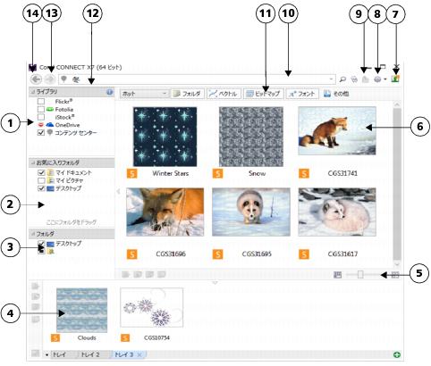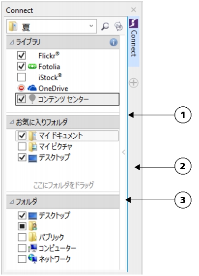 | • | ライブラリ ペイン、フォルダ ペインまたは表示中のペインからフォルダをお気に入りフォルダ ペインにドラッグします。 |