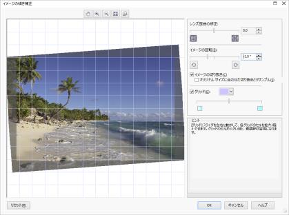 [イメージの傾き補正] ダイアログ ボックスでは、レンズの歪曲とビットマップ イメージの傾きを素早く補正できます。この機能は、傾いて撮影またはスキャンされた写真、またはレンズ歪曲を含む写真を補正するときに便利です。