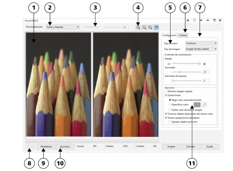 Contiene controles para ajustar la imagen vectorizada. El área Detalle de resultado de vectorización en la página Configuración le permite ver el número de objetos, nodos y colores en la imagen vectorizada mientras aplica ajustes.