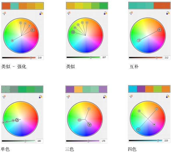 您也可以使用和谐规则从头创建颜色和谐。生成的颜色和谐包含基于所选规则随机创建的五种颜色,而其底色为和谐色样列表中所选择的颜色。