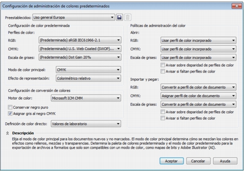 Puede buscar información sobre cada control disponible en los cuadros de diálogo Configuración de color predeterminada y Configuración de color del documento situando el cursor sobre el control y visualizando la descripción en el área Descripción.