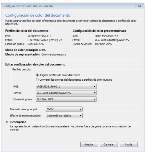 diálogo Configuración de color del documento. Tenga en cuenta que el modo de