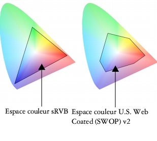 Il peut arriver que de nombreuses couleurs d’un document sRVB puissent être hors gamme pour l’espace couleur U.S. Web Coated (SWOP) v2. Les couleurs hors gamme sont mappées avec la gamme en fonction de l’intention de rendu.