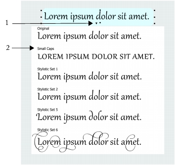 Un clic sur l’indicateur OpenType interactif (1) affiche la liste des fonctionnalités OpenType les plus communes disponibles pour le texte sélectionné.