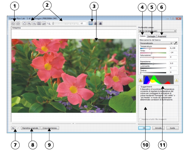 Camera RAW Lab: i numeri cerchiati corrispondono ai numeri nella seguente tabella, che descrivono i principali componenti del laboratorio.