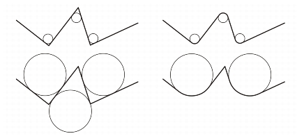 In questo esempio, i cerchi rappresentano le impostazioni del raggio di sagoma. La riga superiore mostra le sagome a sinistra e i risultati sulla destra. La riga inferiore mostra le sagome proposte a sinistra; tuttavia, nei risultati a destra, non tutti gli angoli dispongono di una sagoma. Dopo aver applicato la prima sagoma, non è possibile sagomare l'angolo successivo poiché il segmento linea non è sufficientemente lungo. Questo angolo risulta interrotto e l'angolo finale sarà sagomato.