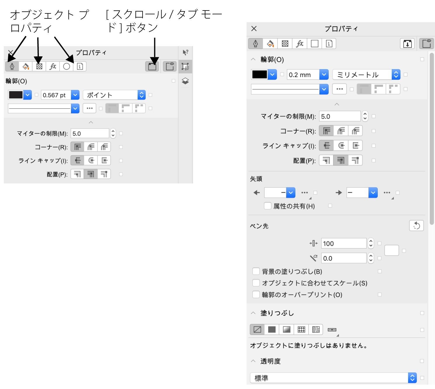 [プロパティ] インスペクタの上部にあるコントロールを使用して、修正するプロパティに素早く移動できます。また、2 つの表示モード、スクロールとタブが使用できます。スクロール モードは、関連するすべてのオブジェクトのプロパティを表示します。目的のオプションにスクロールできます。タブ モードは、一度に 1 つのオブジェクト プロパティのグループのみを表示します。他のオプションは表示されません。たとえば、塗りつぶしオプションのみ表示して、次に、[輪郭] ボタンをクリックして輪郭オプションのみを表示することができます。