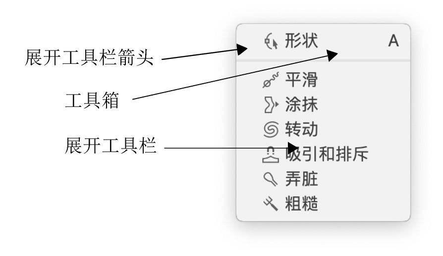 工具箱包含用于绘制和编辑图像的工具。一些工具默认可见,而其他工具则以展开工具栏的形式分组。展开工具栏打开后会显示一系列相关的 CorelDRAW 工具。工具箱按钮右下角的展开工具栏小箭头表示一个展开工具栏。可以通过单击展开工具栏箭头访问展开工具栏中的工具。