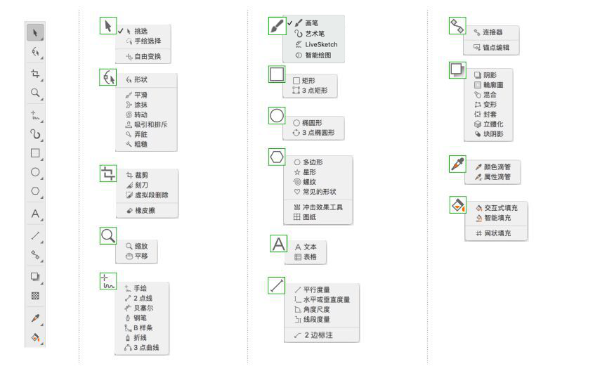 下图显示了默认 CorelDRAW 工具箱中的所有展开工具栏,可以帮助您更轻松地查找工具。