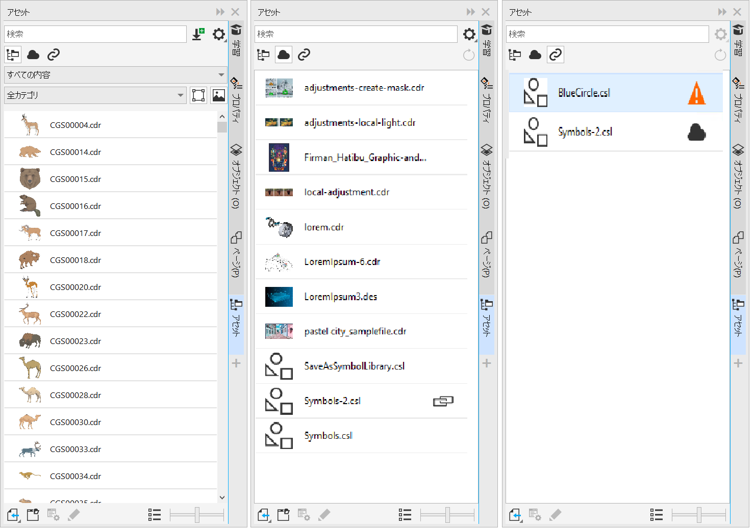 [アセット] ドッキング ウィンドウには、コンテンツの操作に役立つ 3 つのビューがあります。[ローカル アセットとネットワーク アセット] ビューには、ローカル フォルダまたはネットワーク フォルダに保存されているベクトル イメージとビットマップ イメージ、およびその他のアセットが表示されます。[Cloud アセット] ビューには、他のユーザーと共有しているシンボル ライブラリ ファイルを含む、Cloud フォルダ内のファイルが表示されます。[リンクされたアセット] ビューには、アクティブなドキュメントにリンクされたシンボル ライブラリが表示されます。