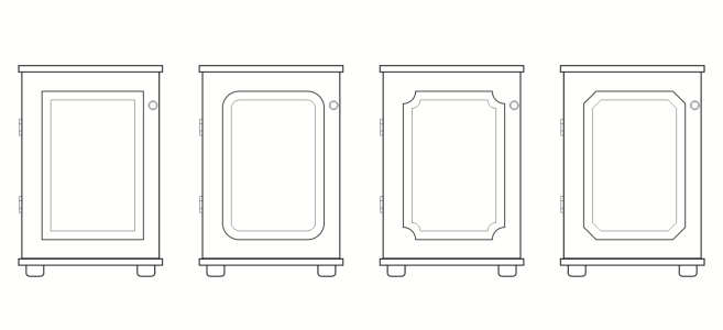 Bei den Schranktüren wurden unterschiedliche Stile auf die Ecken angewandt. Von links nach rechts:Standardecken, abgerundete Ecken, ausgekehlte Ecken und abgefaste Ecken.