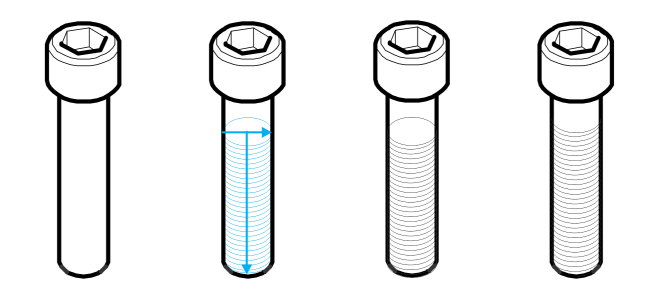 Von links nach rechts: Ein importierter Bolzen; eine Gewindeform wird hinzugefügt; die äußeren Linien der Gewindeform werden entfernt.