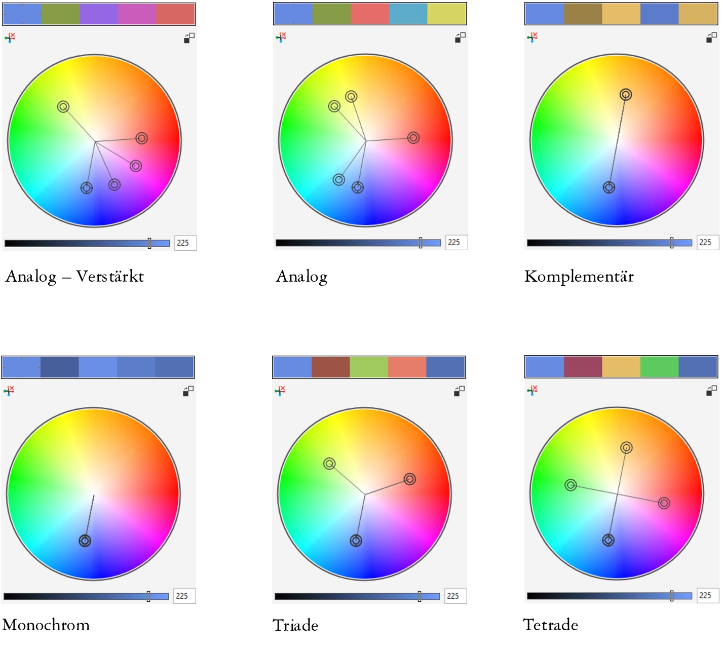 Beispiele für mit Harmonieregeln komplett neu erstellte Farbharmonien