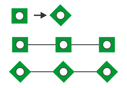 Oben: Die ursprünglichen Objekte wurden gedreht. Mitte: Sie werden entlang einer Strecke angeordnet, die angewendete Drehung wird ignoriert. Unten: Die Objekte werden entlang der Strecke angeordnet und die Drehung wird beibehalten.