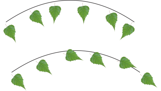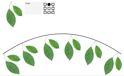 Abstandverfahren „Objektursprung". Der Objektursprungspunkt wird geändert, um den Effekt von Blättern, die an einem Ast hängen, zu erzeugen.