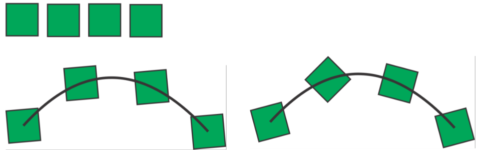 Die Objekte werden gedreht, damit sie der Krümmung der Strecke folgen (oben); die Objekte werden entlang der Strecke platziert, ohne sie zu drehen (unten).