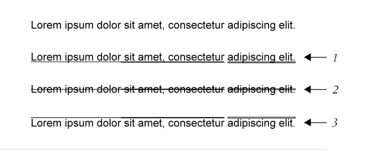 Unterstrichener (1), durchgestrichener(2) und mit einer Linie darüber versehener (3) Grafiktext, wobei einfache und doppelte Linien verwendet wurden.
