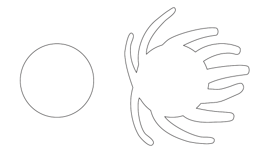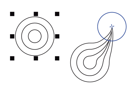 Durch Verwischen und Verschmieren können Sie Objekte umformen, indem Sie Verlängerungen ziehen oder Einbuchtungen entlang des Umrisses einfügen. Die beim Ziehen mit dem Hilfsmittel Verwischen erstellten Verlängerungen und Einbuchtungen ähneln Strichen, die sich etwas in der Breite unterscheiden. Beim Verschmieren haben die mit dem Hilfsmittel Verschmieren gezogenen Verlängerungen und Einbuchtungen eher fließende Formen, die beim Ziehen immer schmaler werden.