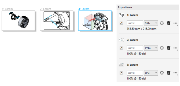Mit Corel DESIGNER 2021 können Sie eine Liste von Inhalten anlegen, um diese dann per Mausklick zu exportieren. Das neue Andockfenster Exportieren bietet eine Vielzahl flexibler und zeitsparender Optionen zur Ausgabe von Seiten und Objekten. Mit wenigen Klicks können Sie Seiten oder Objekte in branchenübliche Formate (inklusive SVG und PDF) übertragen. Dasselbe Designelement kann gleichzeitig mit verschiedenen Einstellungen exportiert werden, indem Sie es im Andockfenster Exportieren duplizieren und die Ausgabeoptionen ändern. Sie können auch mehrere Elemente gleichzeitig exportieren und für alle die gleichen Einstellungen verwenden. Weitere Informationen finden Sie unter Objekte und Seiten exportieren.