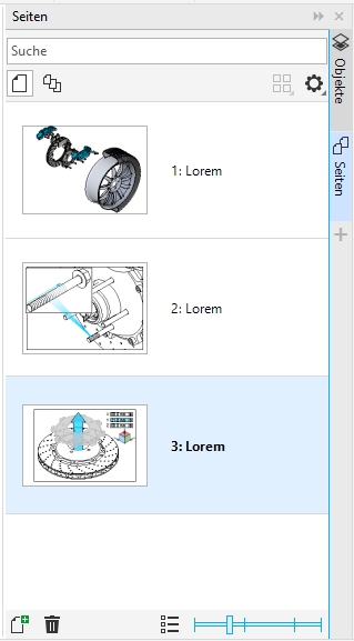Corel DESIGNER 2021 vereinfacht dank dem neuen Andockfenster Seiten die Arbeit mit mehrseitigen Dokumenten. Es listet alle Seiten in einem Design auf, damit Sie diese einfach verwalten und mühelos durch ein Projekt navigieren können. Jede Seite verfügt über eine skalierbare Miniaturvorschau, die deren Größe und Inhalt wiedergibt. Um die Seiten neu anzuordnen, können diese einfach im Andockfenster verschoben werden. Sie können außerdem an einem einzigen Ort Seiten hinzufügen, löschen und umbenennen, wodurch Sie viel Zeit sparen. Mit einem Klick können Sie den Anzeigemodus wechseln, um sich entweder auf eine Seite zu konzentrieren oder die neue Mehrseitenansicht zu nutzen. Weitere Informationen finden Sie unter Seiten.