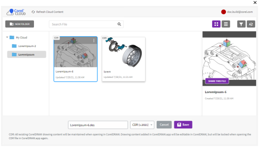 Ein neues Dashboard in Corel DESIGNER 2021 2021 und CorelDRAW.app fungiert als zentrale Stelle für die Zusammenarbeit. Es enthält alle Ihre Cloud-Zeichnungen. Mit einem Klick können Sie eine Vorschau, die Anzahl der Kommentare und Teammitglieder und den Projektstatus anzeigen. Über das Dashboard können Sie Ihre Designs außerdem direkt von Corel DESIGNER 2021 aus weitergeben, ohne jede einzelne Datei öffnen zu müssen.