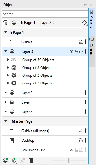 You can also create new master layers by opening the flyout at the bottom of the Objects docker and clicking the respective button: New Master Layer (all pages) , New Master Layer (odd pages)