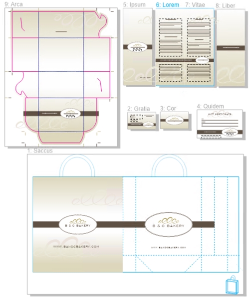 Branding and marketing assets for a bakery business have been arranged on different pages in a document: (page 1) bag; (page 2 and 3) business card; (page 4) gift certificate; (page 5, 6-7, and 8) menu; (9) packaging