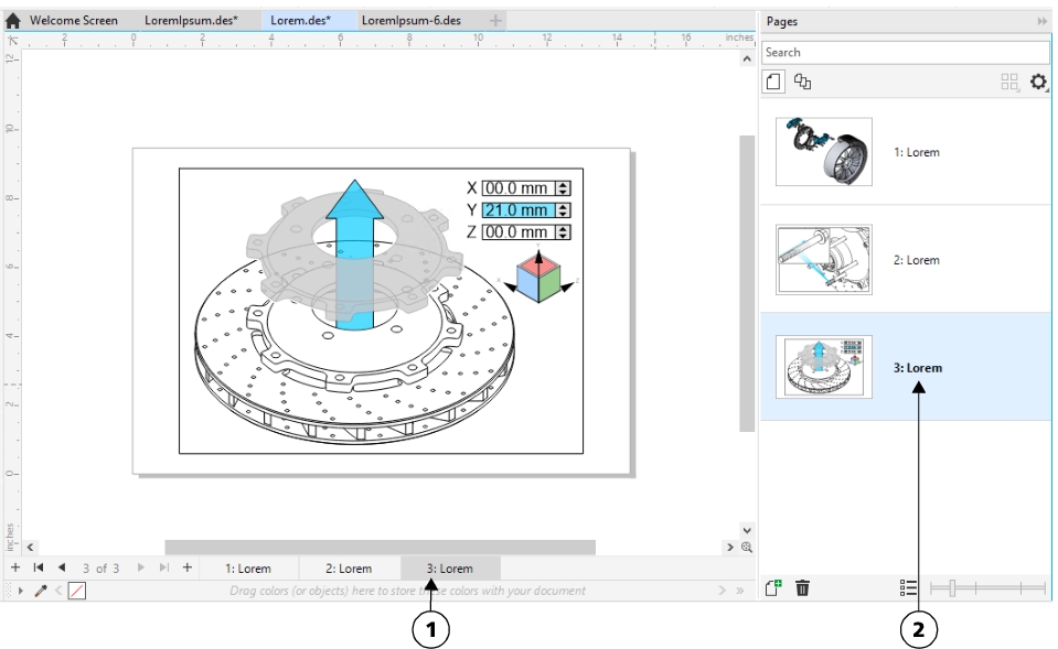 In multipage view, you view all document pages at once without having to constantly click back and forth between tabs. Corel DESIGNER provides options to display pages in document order or free-form mode. When designing and reviewing proofs for printed materials, such as brochures, books, and magazines, where pages have a fixed sequence, you can choose to arrange pages in a column, row, or grid. Custom mode, which allows for a free-form, non-sequential layout, is great for working with documents in which different assets for a project are placed on separate pages.