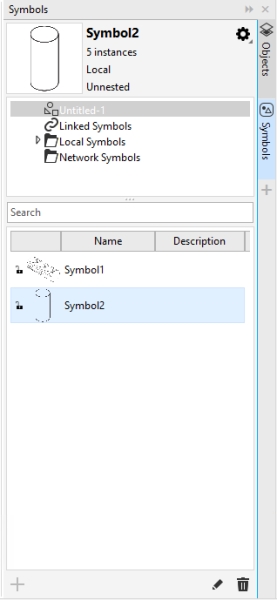 Symbols docker. The preview area at the top shows the name of the selected symbol, the number of instances in the document as well as the symbol type (linked or local). The tree view below the preview area lets you see all linked and local symbols in the active document and navigate to symbol libraries.
