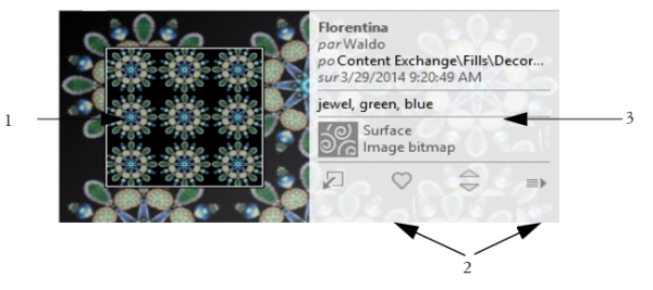 Corel DESIGNER vous permet de parcourir les motifs vectoriels, les motifs bitmap et les surfaces dégradées disponibles dans le Centre de contenu ou dans votre bibliothèque personnelle. Ces surfaces peuvent aussi être utilisées comme motifs de transparence. Pour plus d’informations, reportez-vous à la section Modification de la transparence des objets.