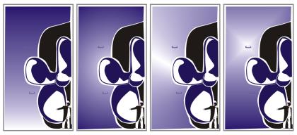 グラデーション塗りつぶしには、(左から右に) 線形、楕円形、円錐形、および長方形の 4 種類があります。