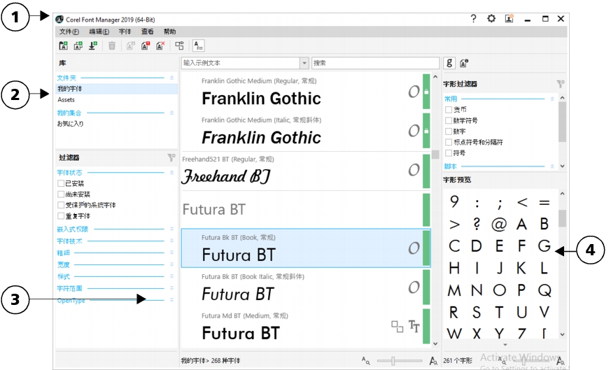 Corel Font Manager 包括以下组件:标题栏 (1)、库窗格 (2)、预览窗格 (3) 和属性窗格 (4)。