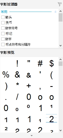 您也可以查看字体的字形。印刷字形与字样的单个字符或字符组合相对应。您可以选择查看字体的整个字形集,也可以应用过滤器来仅显示某个子集。