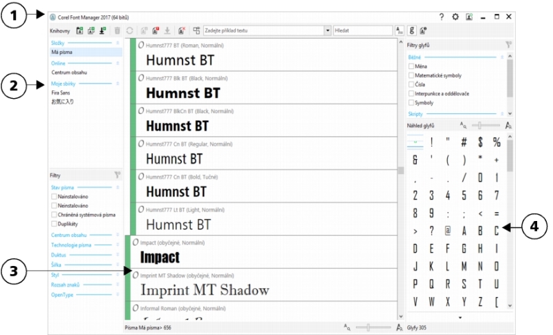 Správce písma Corel obsahuje následující komponenty: záhlaví (1), podokno Knihovny (2), podokno Náhled (3) a podokno Vlastnosti (4).