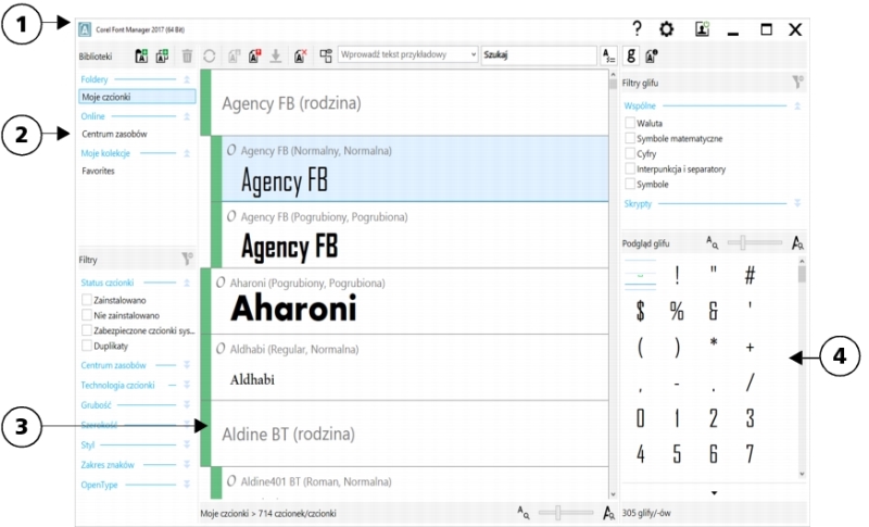 Corel Font Manager zawiera następujące elementy: pasek tytułu (1), okno Biblioteki (2), okno Podgląd (3) i okno Właściwości (4).