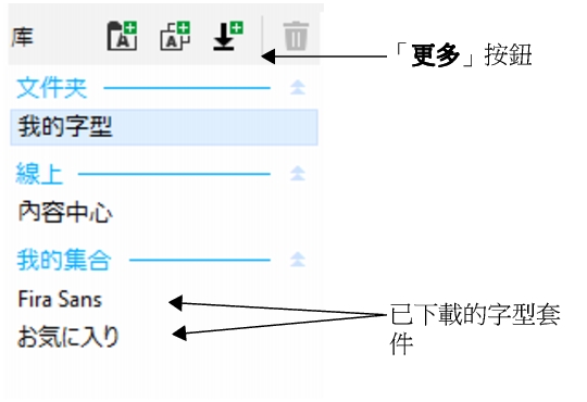 「更多」對話方塊可讓您存取其他字型,一般是以字型套件來分組。部分字型套件可免費使用,有些則需要購買。您可以取得關於字型套件的資訊,瞭解套件中包含哪些字型,並檢視字型樣本。您也可以下載每個字型套件的樣本表。