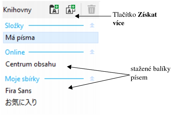 Dialogové okno Získat více umožňuje zpřístupnit další písma, která jsou obvykle seskupena v balících písem. Některé balíky písem jsou zdarma, zatímco jiné je třeba koupit. Můžete si zobrazit informace o dostupných balících písem a písmech, která zahrnují, včetně zobrazení vzorků písem. Můžete si také stáhnout vzorový list každého písma.