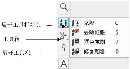 单击克隆工具的展开工具栏箭头将会打开润色工具展开工具栏。