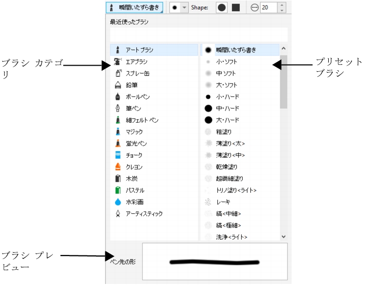 [ブラシ] ピッカーでは、ブラシ カテゴリにまとめられているプリセット ブラシをプレビューおよび選択できます。