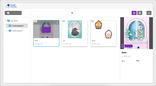 A new dashboard in both CorelDRAW 2021 and CorelDRAW.app acts as your collaboration hub. It contains all your Cloud drawings and in a click displays a preview, the number of comments and team members, and project status. The dashboard also lets you share designs directly from CorelDRAW 2021 without having to open each file.