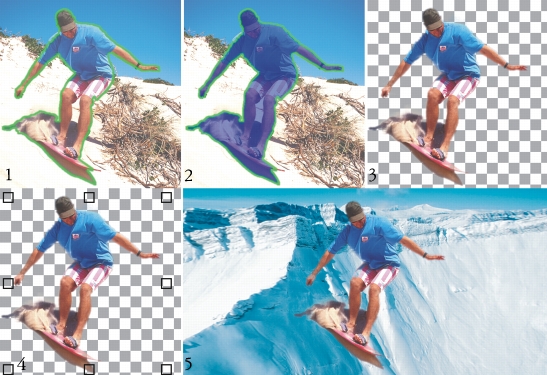 Cutout Lab workflow: (1) Highlight the edges of the image area; (2) Add a fill to the inside. (3) Preview the cutout and touch it up if needed. (4) Bring the cutout into the image window. (5 — optional) Place the cutout against a background image.
