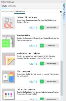 Sie können Ihre Sammlung kreativer Werkzeuge erweitern, indem Sie direkt in CorelDRAW und Corel PHOTO-PAINT Anwendungen, Plugins und Erweiterungen entweder kostenlos herunterladen oder erwerben. Sie können Ihre kostenlose Lizenz des Corel Website Creator herunterladen, für eine optimale Gestaltung Ihres RAW-Workflows AfterShot Pro erwerben, Corel ParticleShop zur Erzeugung beeindruckender Bitmap-Effekte benutzen und vieles mehr. Um auf diese Sammlung kreativer Werkzeuge zugreifen zu können, müssen Sie über eine Internetverbindung verfügen. Weitere Informationen finden Sie unter Inhalte mit dem Andockfenster „Weitere Werkzeuge" finden.